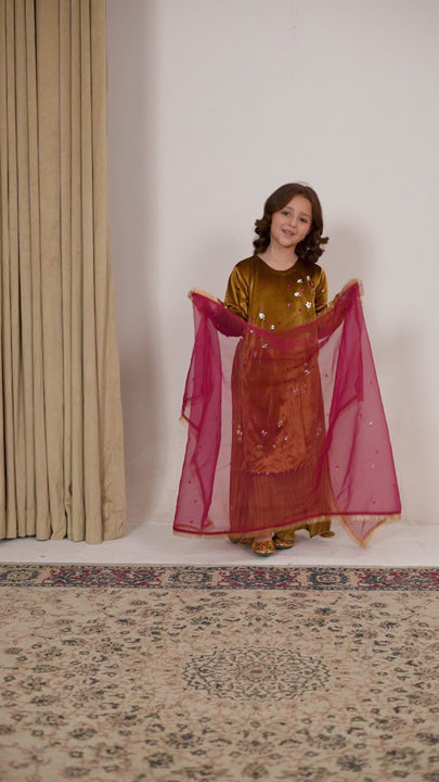 This enchanting ensemble mirrors the sophistication of the adult version — a luxurious Korean velvet shirt with intricate adda work, sequins, and diamantes, paired with a flowy crushed silk pleated skirt that moves like a dream.