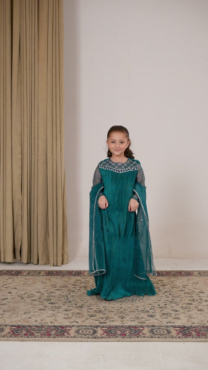 For your little star, Jewel of Alara (Kids) mirrors the elegance of its mother’s design, blending comfort with festive charm. The zinc pleated silk maxi flows beautifully, while the neckline dazzles with hand adda diamanté detailing and a delicate criss-cross diamanté chain.