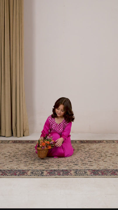 Every stitch of Mini Ruby tells a story of joy. The soft silk fabric ensures comfort, while the silver handwork brings a festive glow — making it perfect for little girls to feel special, confident, and just as elegant as mom. Pair it with pretty sandals or soft curls for a picture-perfect moment.